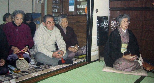 2001/1/20/10:30大寒雨/祖母50回忌/父25回忌の法事 雨のせいか参り手が少なかった。お下がりがあると、部落の皆さんがお参りしてくれて一緒にお経をあげ説教を聞きます。私は灯り(蝋燭)を替えて香(線香と香)を新たに焚きます。しびれた足を引きずるのがいやで、あぐらをかいています。お寺は鳩浦の立法寺です |