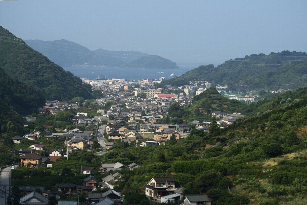 手前は中の内、中央の建物は津久見小学校、右側に幽かに見える緑のネットは津久見高校第2グランド