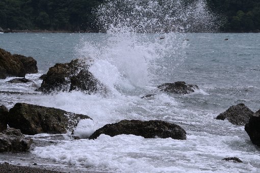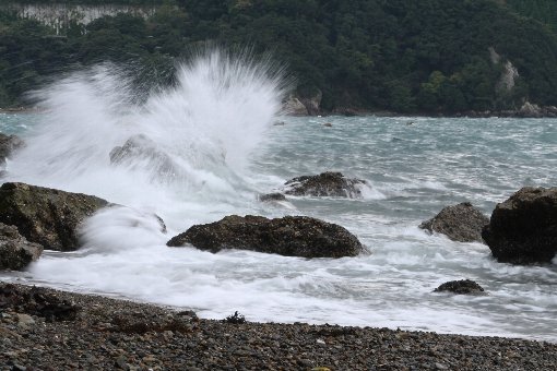 | 何時もは波静かな、リアス式海岸の奥にある海辺は荒波、カメラを向けてると何故か東映映画を思い出し ワクワクドキドキして来ました 波の後ろから三角マークの中に「東映」とバーンと白文字で始まる東映映画・・・ ウオッホン・・・「チャンバラ世代」しか理解できないお話ですね、私も少しパニックっちゃいました。 この項、意味不明ながら 「完」 |