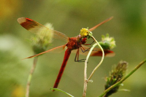ベニトンボ・・・こちらは大変です 葉っぱの付け根に胸が挟まったまま風に煽られてます |