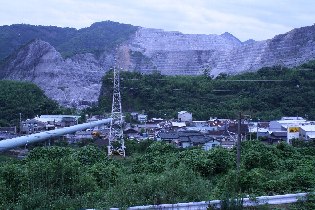 | 青江小学校の運動場の向こうはどんどん川、その向こうの石の山は |