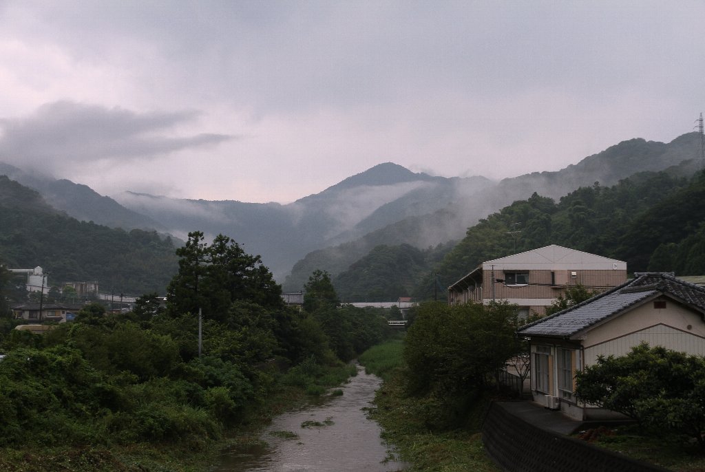 | 8月22日の姫岳 と どんどん川(現:青江川) 右は「畑・岩屋口公民館」と「岩屋口市営住宅」 |