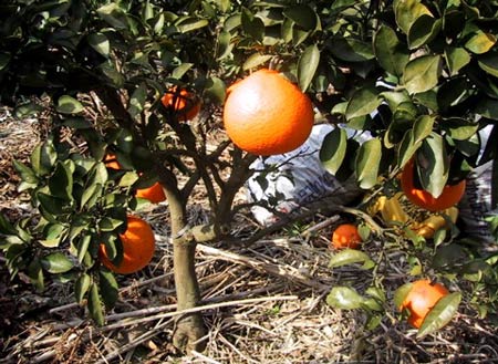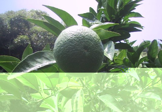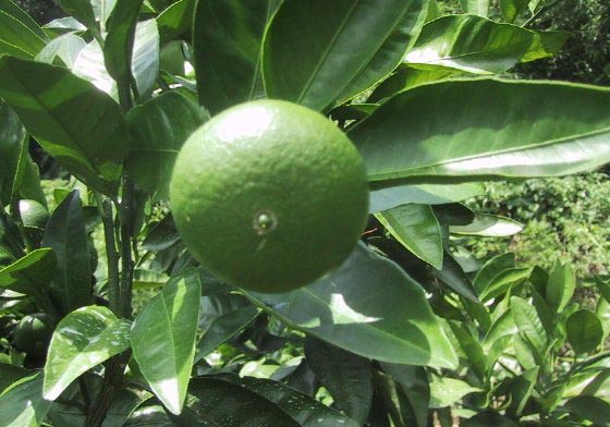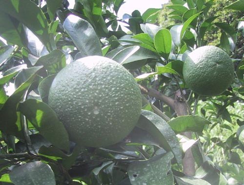 台風の後予防 甘夏に白い薬が かかっています |