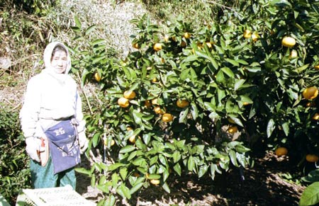 | 2001/11/22「みかんをもぐので、写真を撮ってくれぇー」来年もできるか分からないので記念撮影。生きた証、元気な時の写真を 「サンつくみ」と母です75歳 |